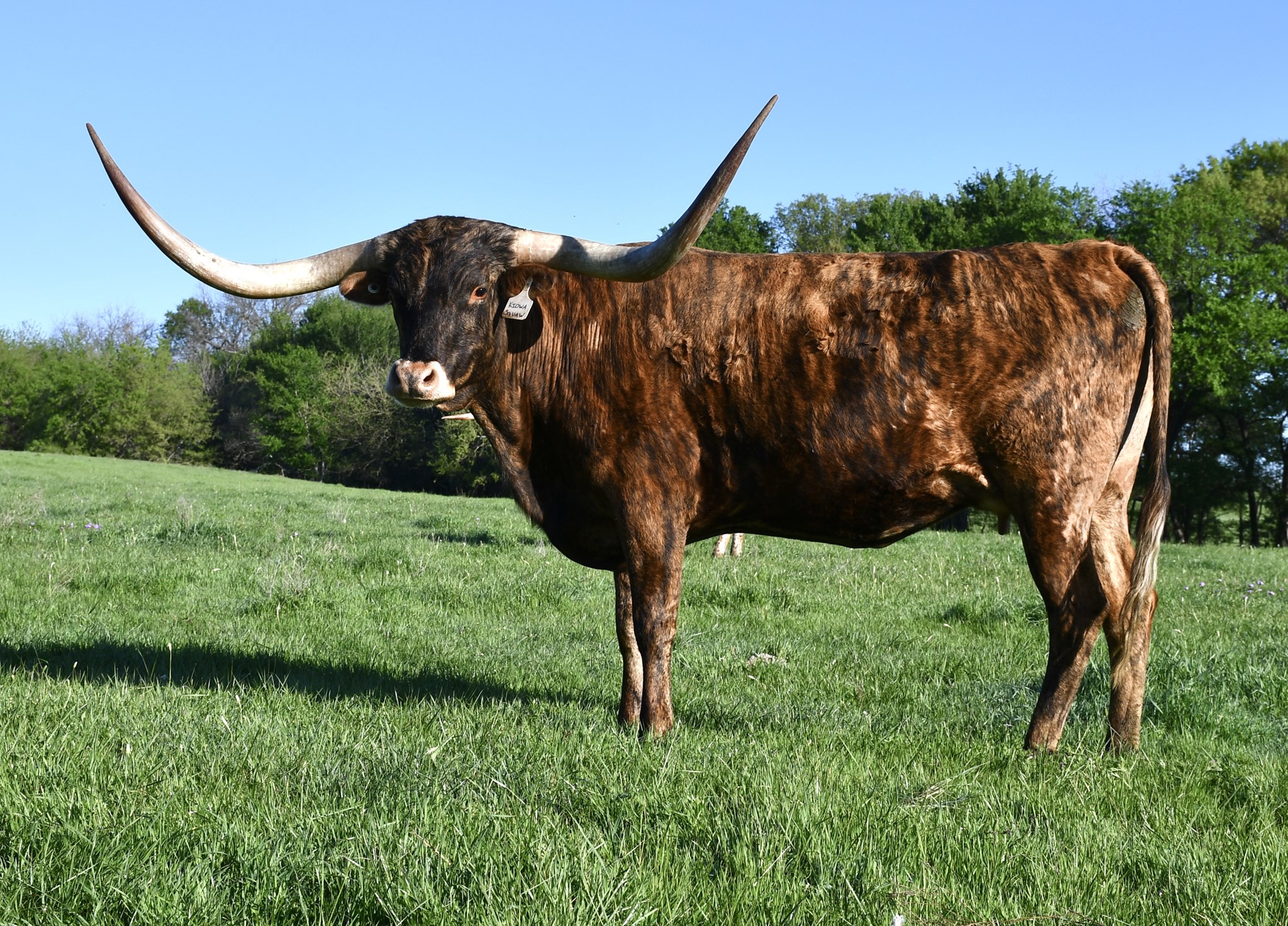 Beautiful, sweet, brindle cow with a perfect udder and ton of total horn. Bull calf at side by JH Rural Safari, and confirmed bred back the same for a 3 in 1 package!