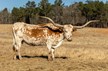 Hudson bred Fifty Fifty BCB daughter, a wonderful producer, having six consecutive heifers, (four for us), before having a super flashy bull calf! Her pedigree also includes legendary longhorns J.R. Grand Slam, (sire of JP Rio Grande, D/O Miss Grande, and Rowdy HR), GF G-MAN, Colorado Cowboy, Senator, Ranger's Measles, and Bail Jumper! Perfect conformation, gorgeous horn set, an excellent mother and milker!