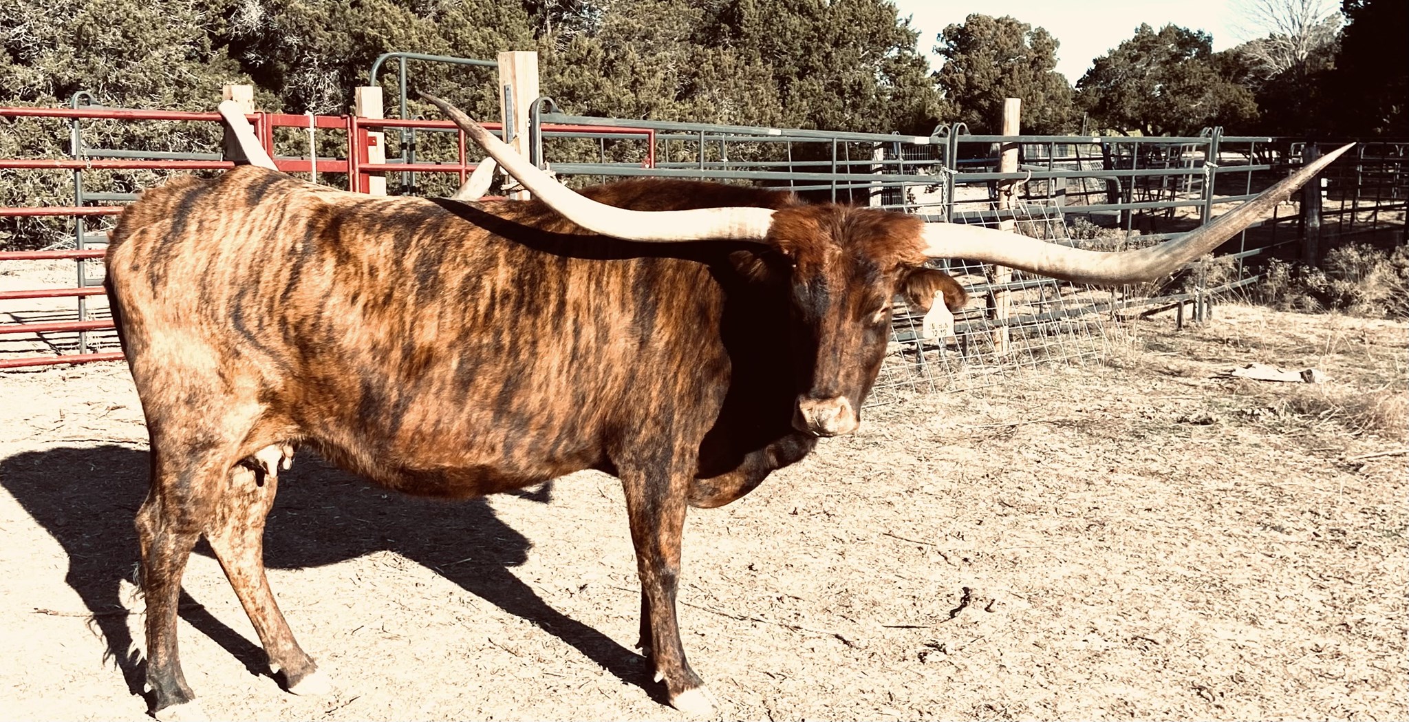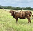 Stunning, tall, big bodied bundle of brindle, this Jamakizm daughter is solid gold and black, topped with horns that gently slope to reach 92.5"TTT! Aptly named, Sunny will warm your heart with her friendly disposition when she eats as many treats as she can from your hand!